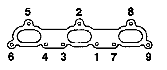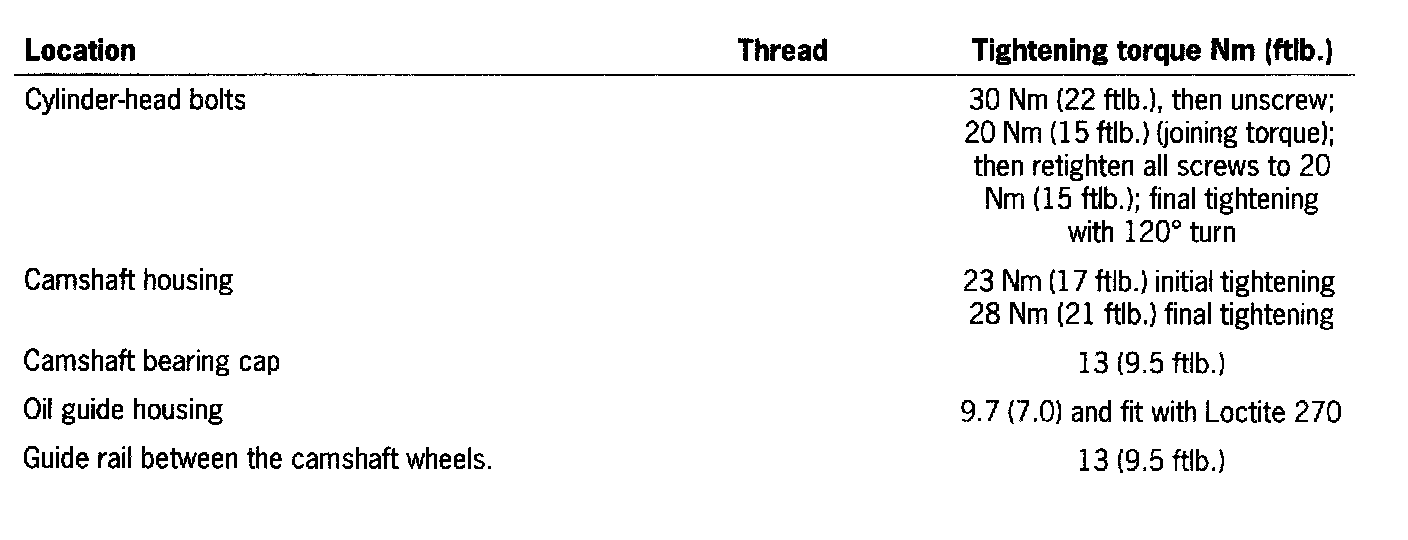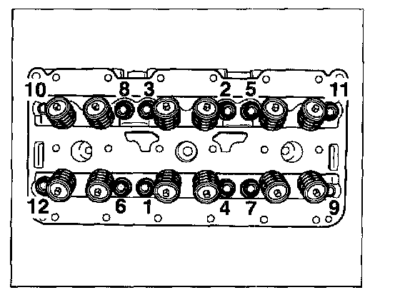 Position the nine fastening screws on the cylinder head by hand and tighten in two stages. First stage to 25 Nm (18 ftlb.). Second stage to 33 Nm (24 ftlb.). Tighten in accordance with the sequence shown.