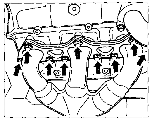 2. Tighten exhaust manifold on the cylinder head. Position exhaust manifold with new seals (cylinder head and on the catalytic converter) on the cylinder head and insert in the exhaust catalytic converter at the same time. Position the nine fastening screws on the cylinder head by hand and tighten in two stages. First stage 25 Nm (18 ftlb.). Second stage 33 Nm (24 ftlb.).