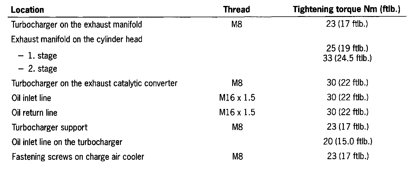 1. Fit turbocharger. Insert a new seal between the turbocharger and the exhaust manifold and tighten the three fastening screws to 30 Nm (22 ftlb.).