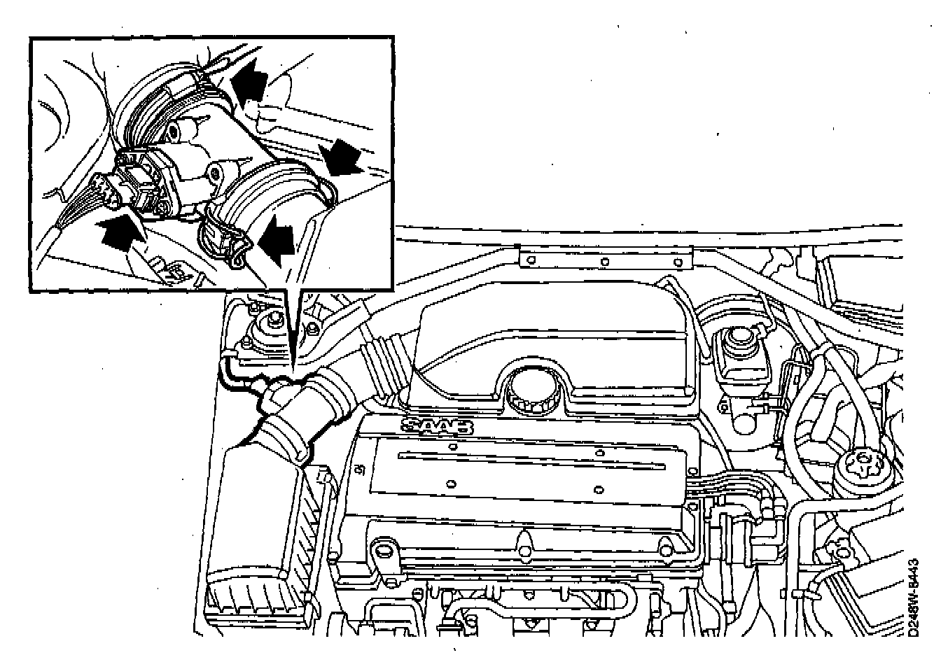 Unplug the connector, undo the hose clip, release the catches and remove the mass air flow sensor.