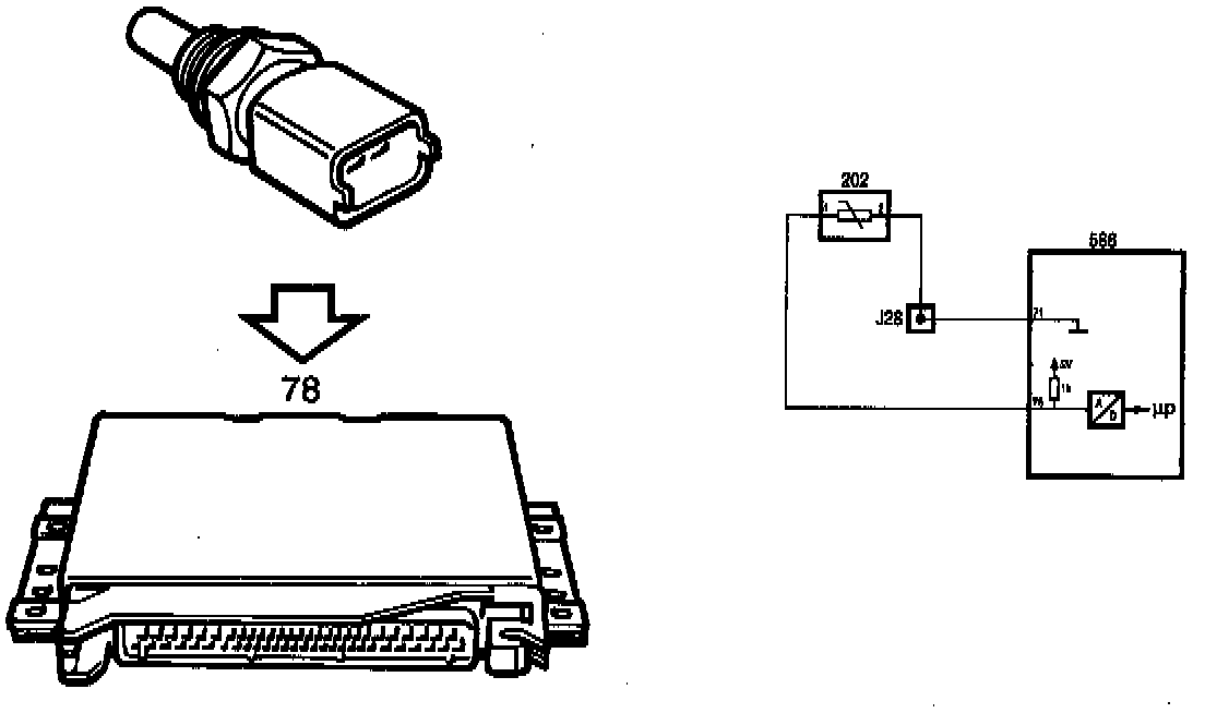 The control module measures the coolant temperature by applying 5 V to the sensor from pin 78 via an integral 1 k ohm resistor. The sensor is grounded via control module pin 71.