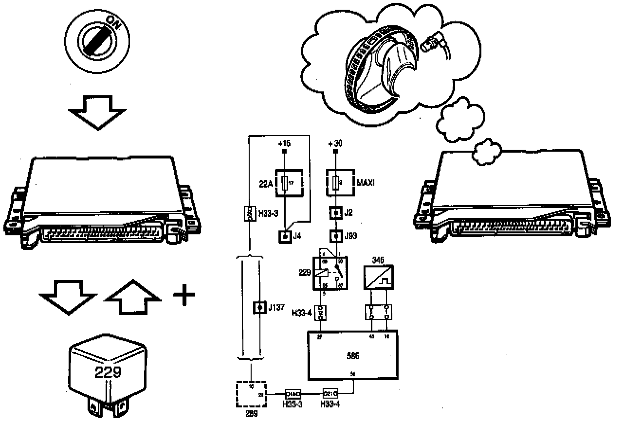 Turning the ignition switch to the ON position activates the control module and grounds pin 27, causing the main relay to operate. The control module then waits for signals from the crankshaft position sensor.