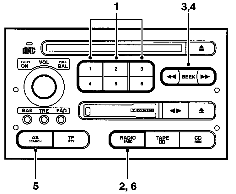 5 Automatic search with storage (AS) of the 6 strongest radio stations on the AM or FM band.