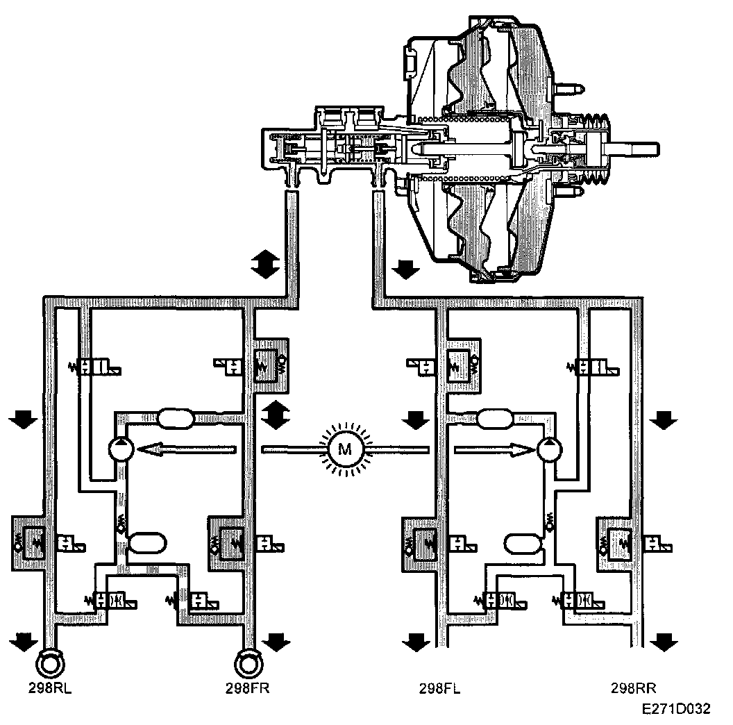 The return pump, which returns excess brake fluid to the master cylinder, is activated only when the ABS mode is operative and the outlet valve is open