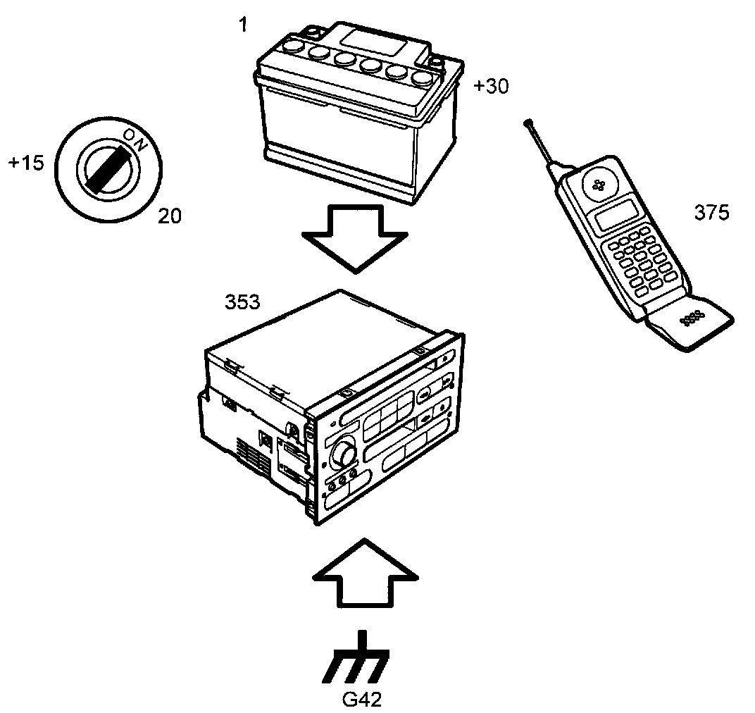 - Receives the audio signal (line input) from the telephone (incoming sound) via the telephone contact and reproduces it via the audio system speakers.
