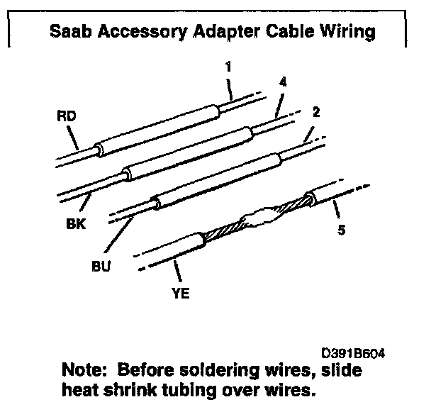 All connections to the Saab accessory adapter cable (P/N 49 42 058) should be soldered then heat shrink tubing applied over the solder joint. Care must be taken to insure no bare wires are exposed. The wire colors and connections for all Nokia car kits (CARK-11US and CARK-91US) are similar. CARK-11US and CARK-90US has a 4-pin connector (PCH-4); CARK-91US, CARK-103 and CARK-105 have a 5-pin connector (PCH-5) with the additional wire (green) being for a power antenna trigger which is unused in this application.