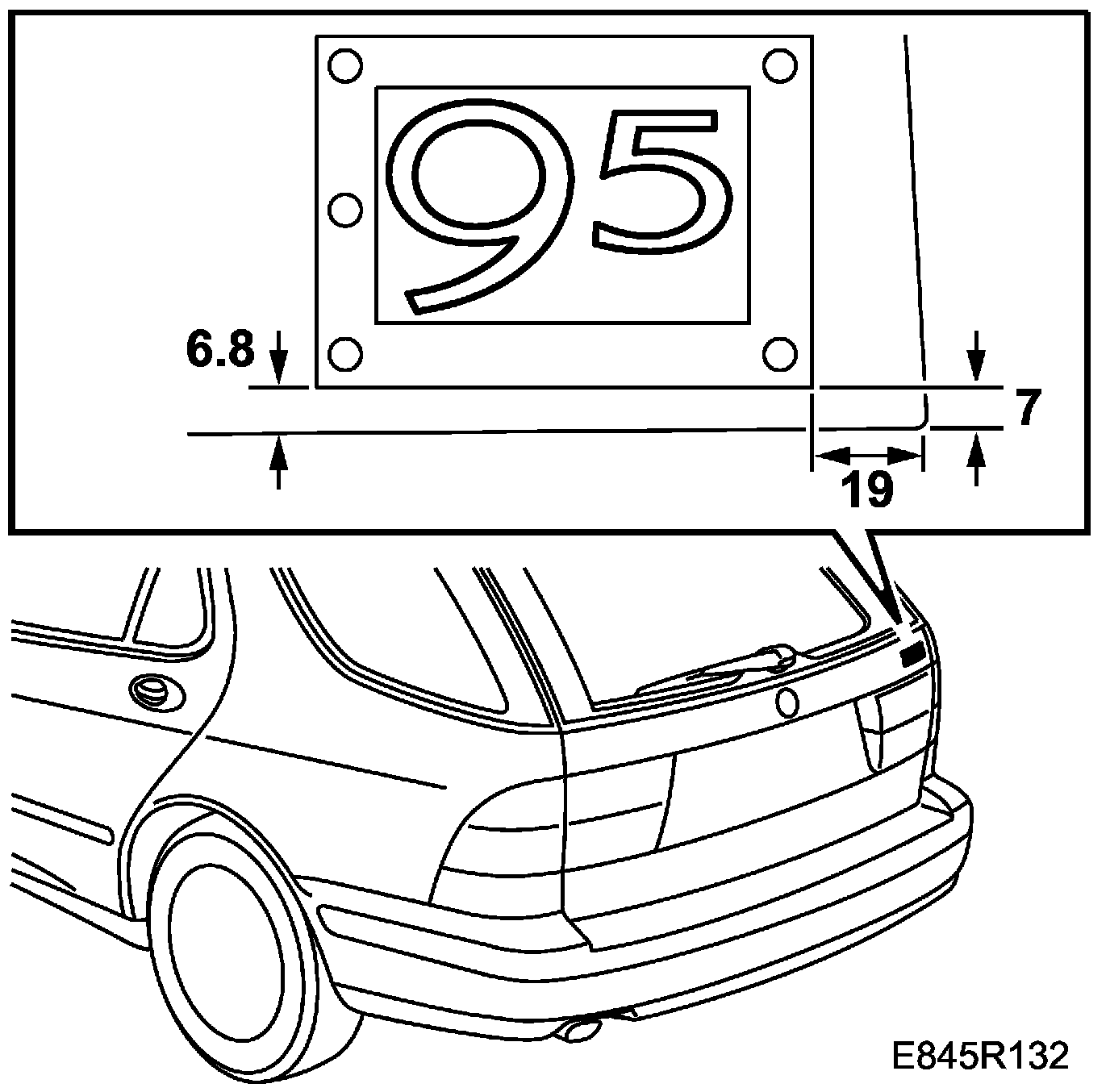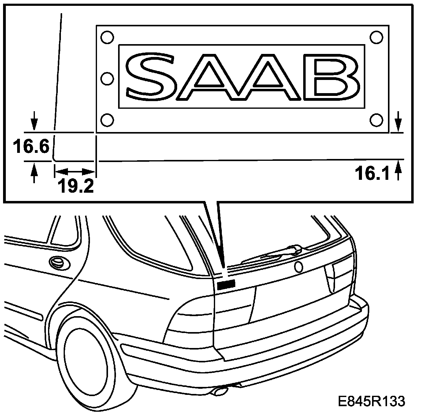 2. Measure in the frame on the tailgate as shown in the illustration and fit the SAAB emblem.