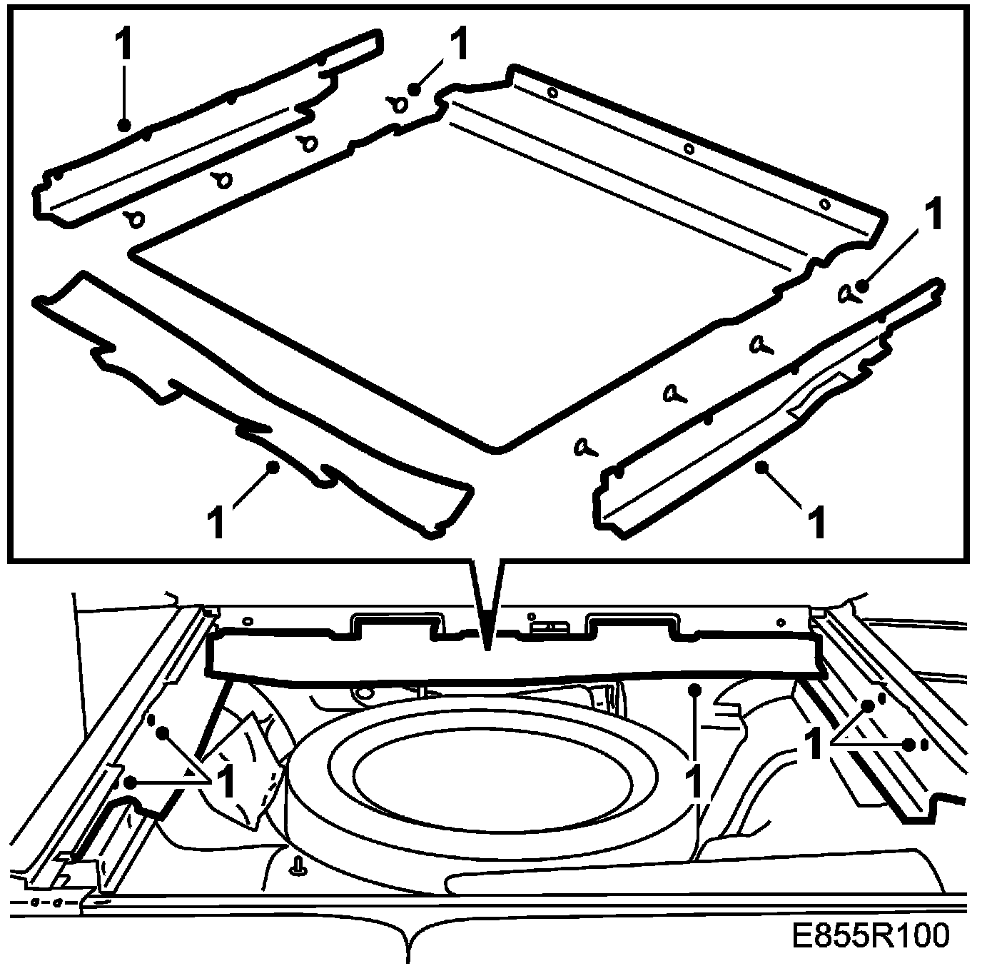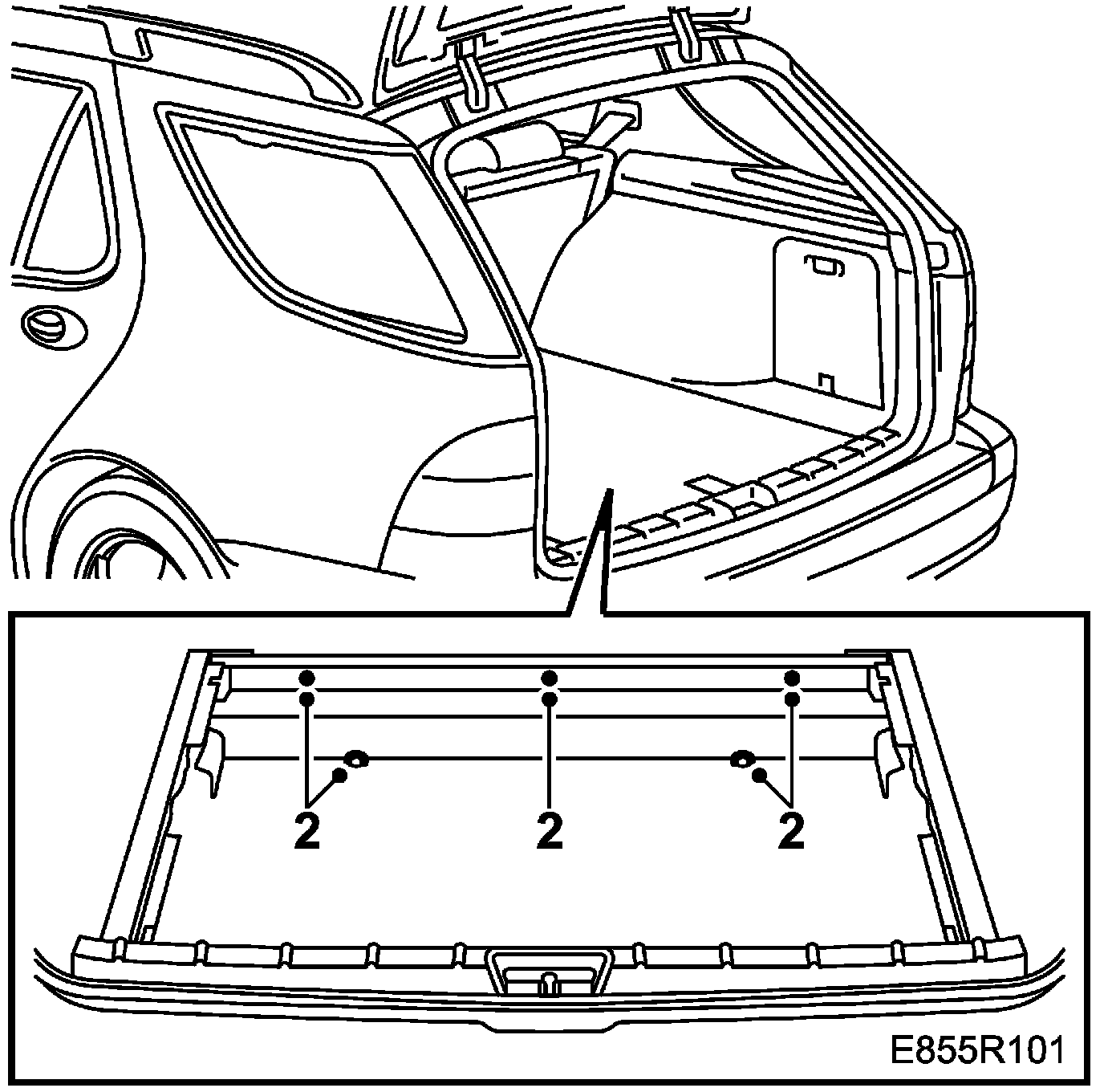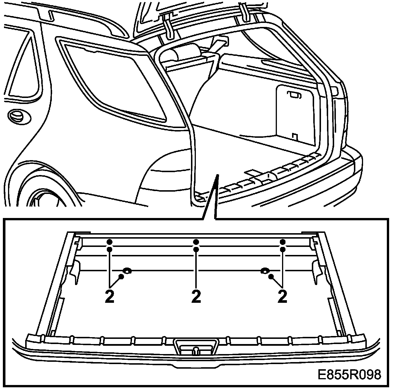 2. Remove the trim over the spare wheel, 3 clips and 2 nuts at front.