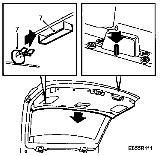 8 Remove the pin from its hole by moving the trim slightly downwards. Lower the trim, making sure that the lamps pass out through their respective openings.