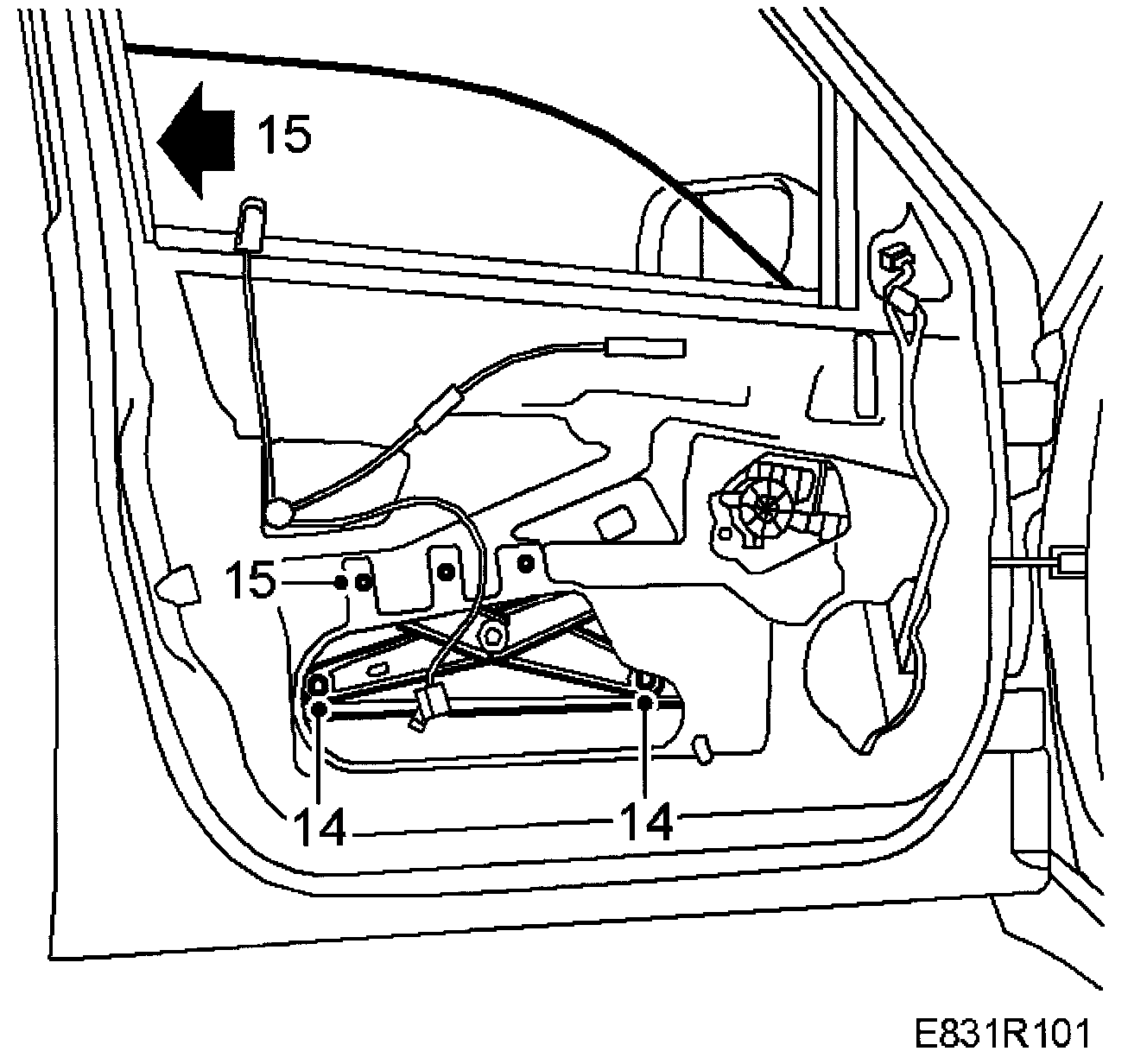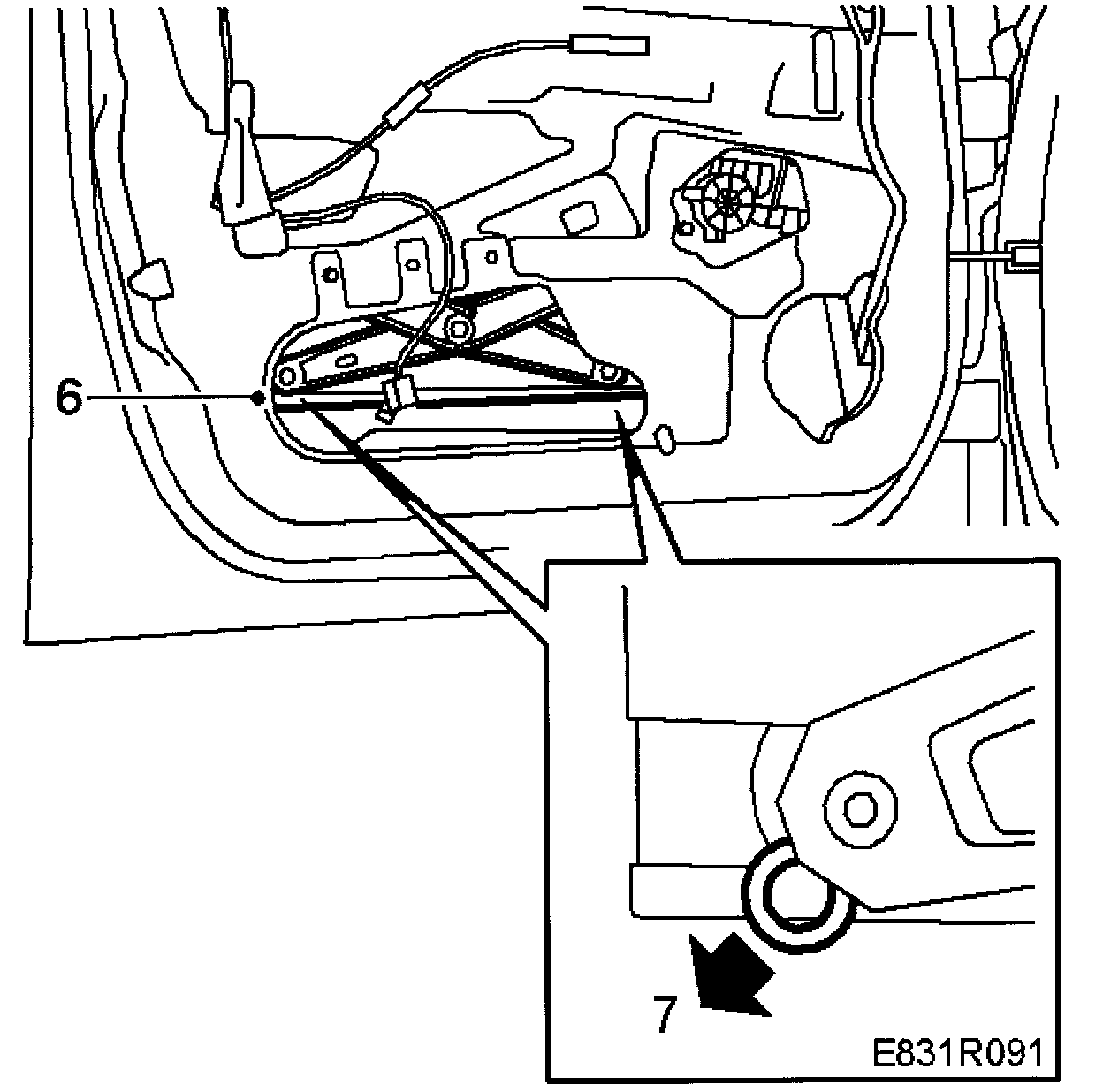 6 Lower the window lift so that the mounting is visible at the top of the lower large hole. The clips on the rollers are then easily accessible.