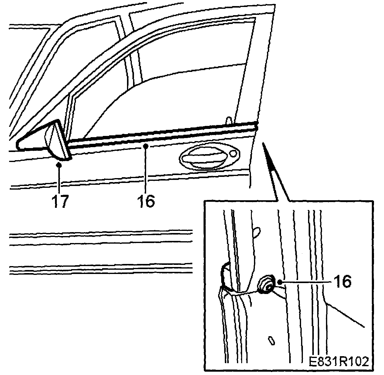 5 Loosen the door mirror retaining screws slightly so that the weatherstrip can easily be removed. Then remove the outer weatherstrip, which is secured by one screw at the rear end.