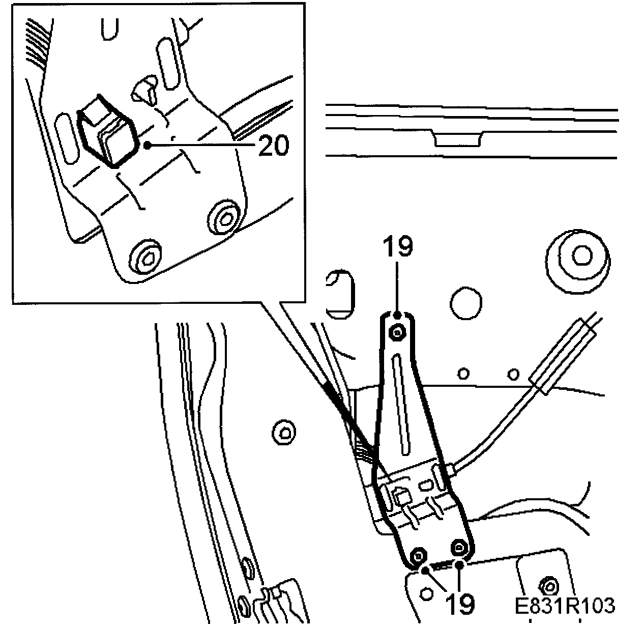 14 Press the scissor-lift brace into the window mounting rollers.