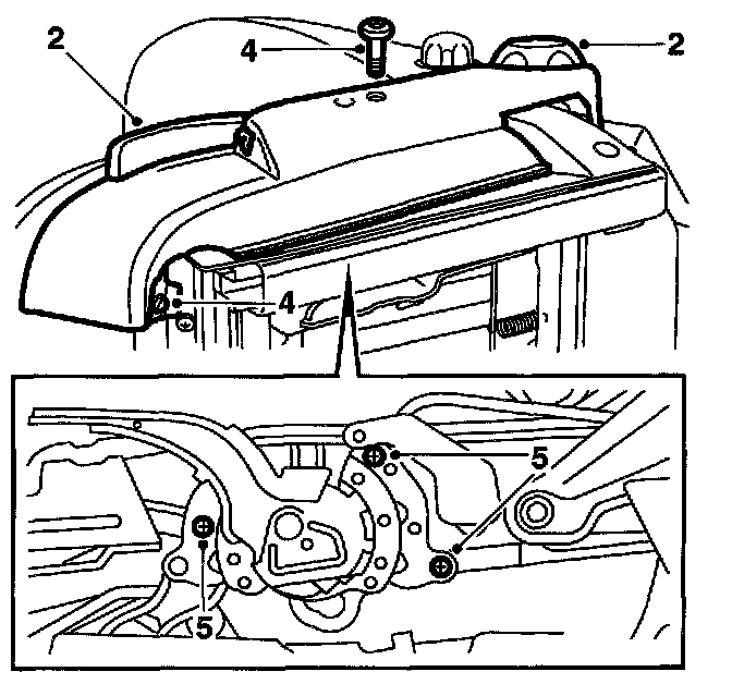 4 Remove the upper seat cowl, 2 covers and 3 screws. Lift the cowl at the back and pull forward.