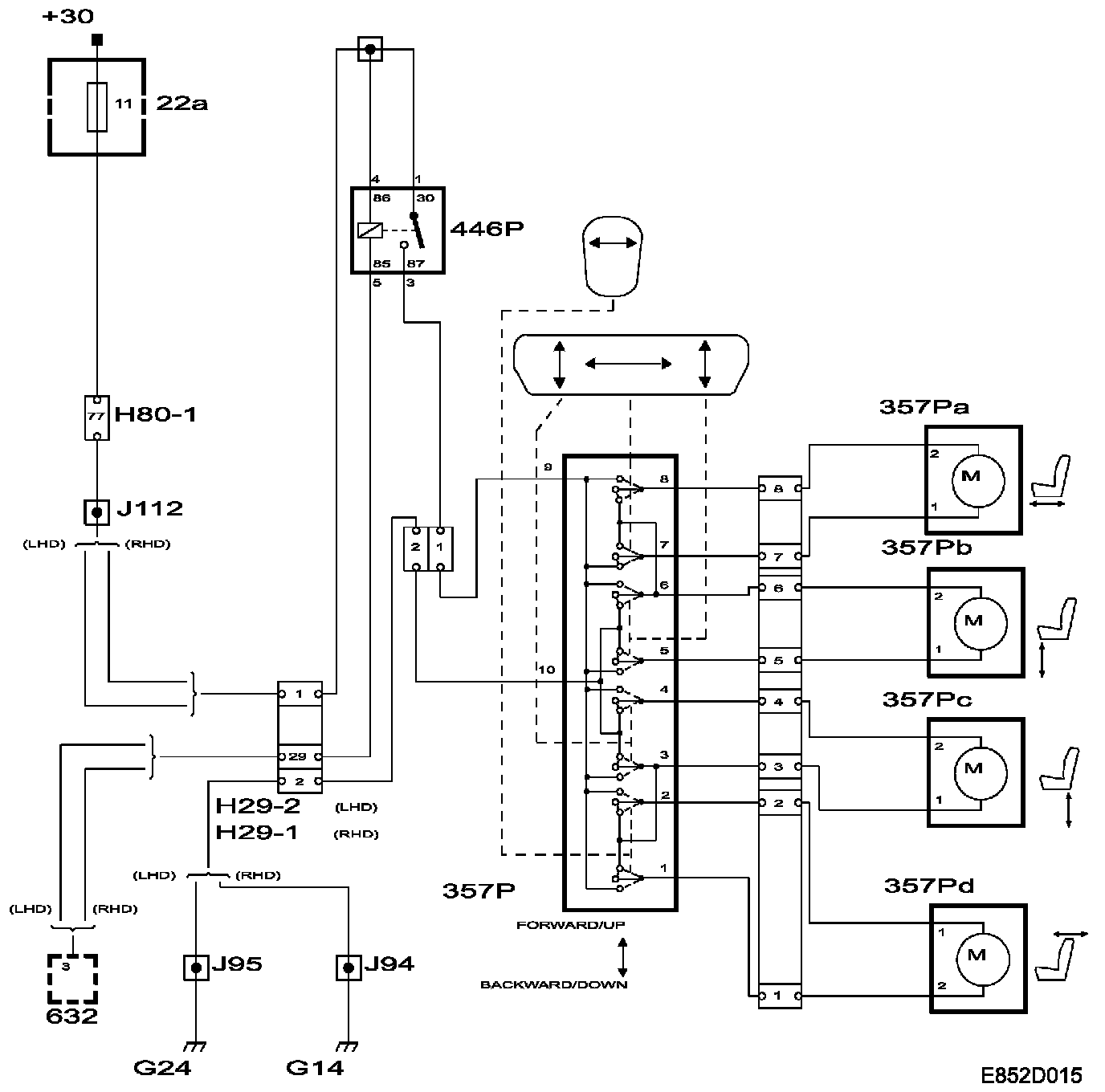 When the ignition is ON (+15 and +54 circuits), power is provided permanently to the switch in the passenger seat. When the ignition is OFF and a front door is open, power is supplied for 20 minutes. If the door is shut and then opened again, power is supplied for a further 20 minutes.