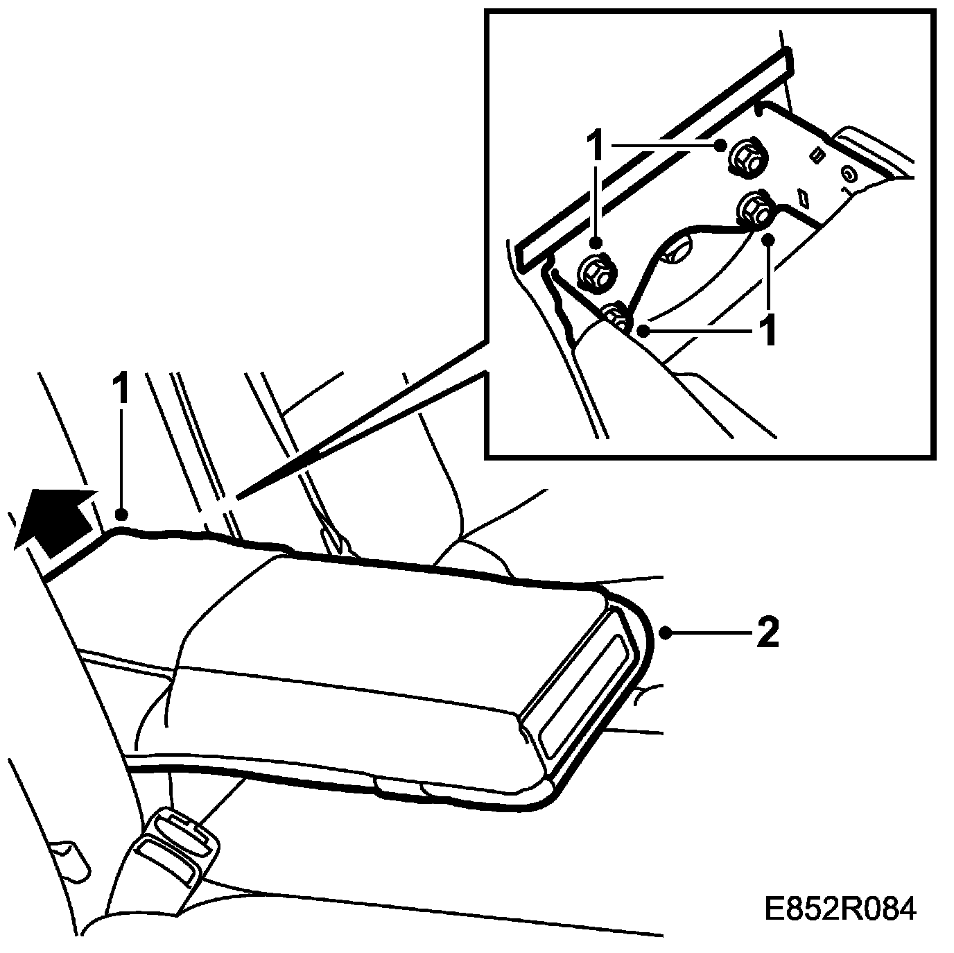 1. Lower the armrest and detach the upholstery tab from the edge of the plate. Remove the four nuts and lift off the armrest.