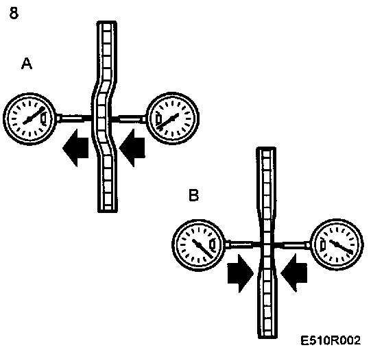 8. Rotate the disc and read the gauges. Note the runout (A) and variation in thickness (B).