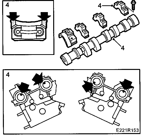 Coat the cylinder head contact surfaces of the front bearing caps sparingly with part No. (10) 74 96 268, see illustration. Fit the camshafts, stuffing boxes and bearing caps, starting where the cams point downwards and press on the tappets.