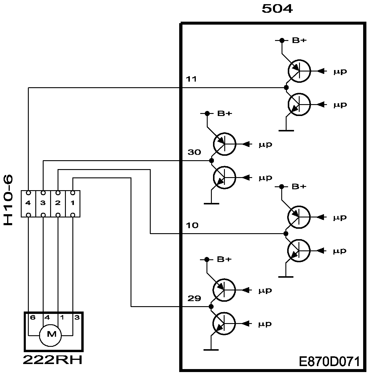 The stepping motor for the right air-mixing flap is supplied with current from the MCC unit pins 29 and 10 (winding 1) and pins 30 and 11 (winding 2).