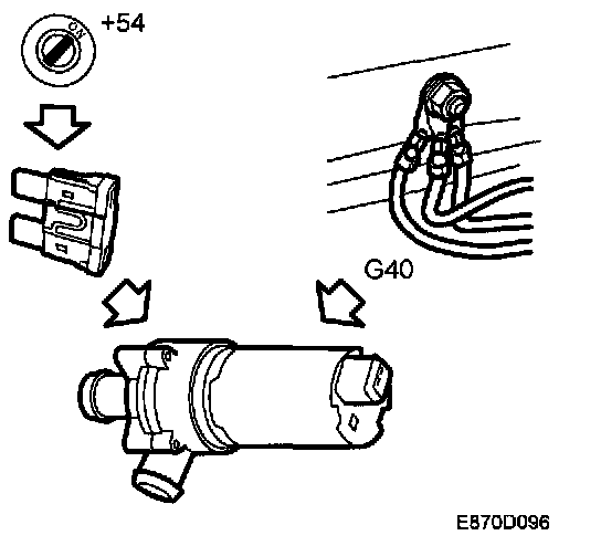 Certain engine types are equipped with a circulation pump to improve the flow of coolant through the heat exchanger. The pump is supplied with +54 current and therefore runs continuously while the car is being driven.