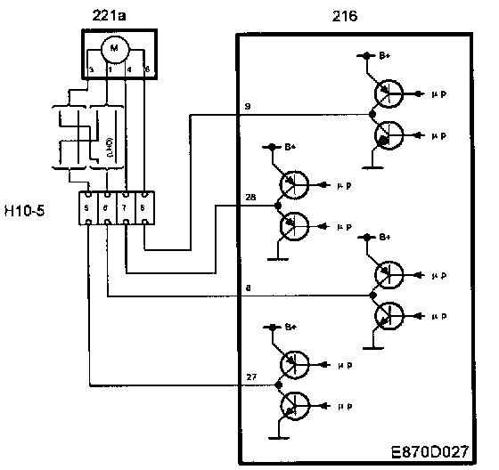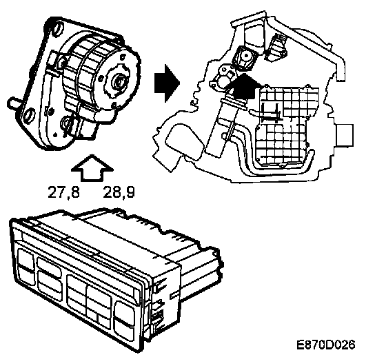 The stepping motor for the air distribution flap is supplied with current from the ACC unit pins 27 and 8 (winding 1) and pins 28 and 9 (winding 2).