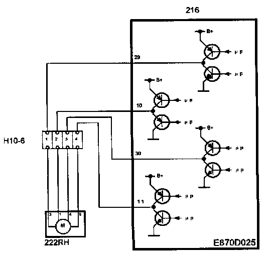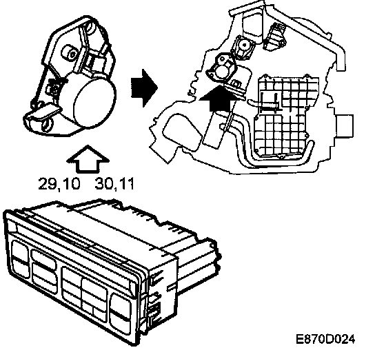 The stepping motor for the right-hand air-mixing flap is supplied with current from the ACC unit pins 29 and 10 (winding 1) and pins 30 and 11 (winding 2).