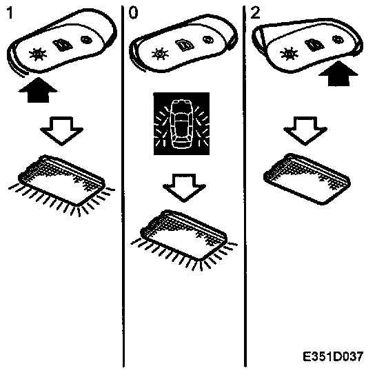 The floor lighting under the dashboard goes on when one or more doors are opened and the ignition switch is OFF (key removed). The floor lighting stays on as long as one or more doors are kept open. After 20 minutes the floor lighting is automatically turned off. If the ignition is ON (+15 or +54), the floor lighting stays on until all the doors are closed.