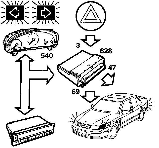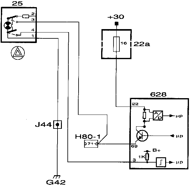 +30 voltage is always supplied to pin 22 of the control module. When the hazard flasher switch is activated, it closes and pin 3 of the control module is grounded via the switch. Voltage pulses from the control module are then fed to all the direction indicator lamps on the car.