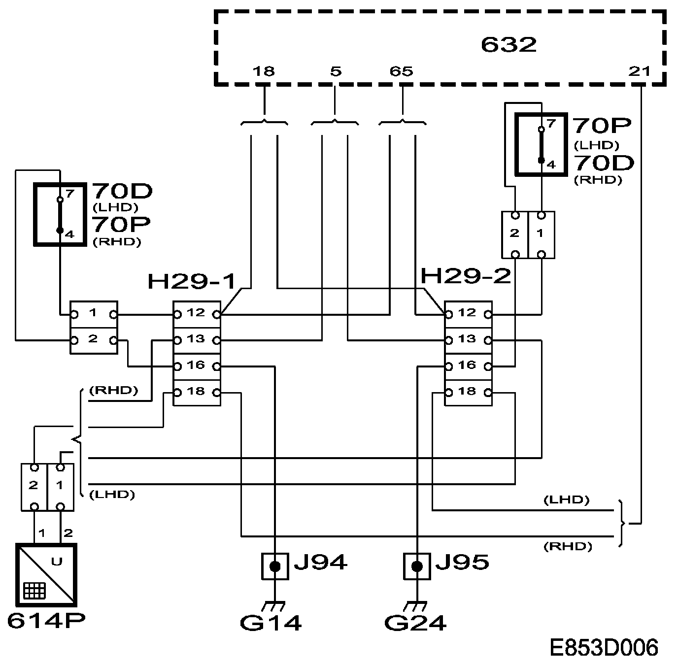 The front passenger seat cushion contains a sensor which detects load. The passenger seat sensor (614P) is connected across pins 5 and 21 of TWICE. Voltage is supplied to the sensor from pin 5 via a resistor in TWICE, and pin 21 is grounded.