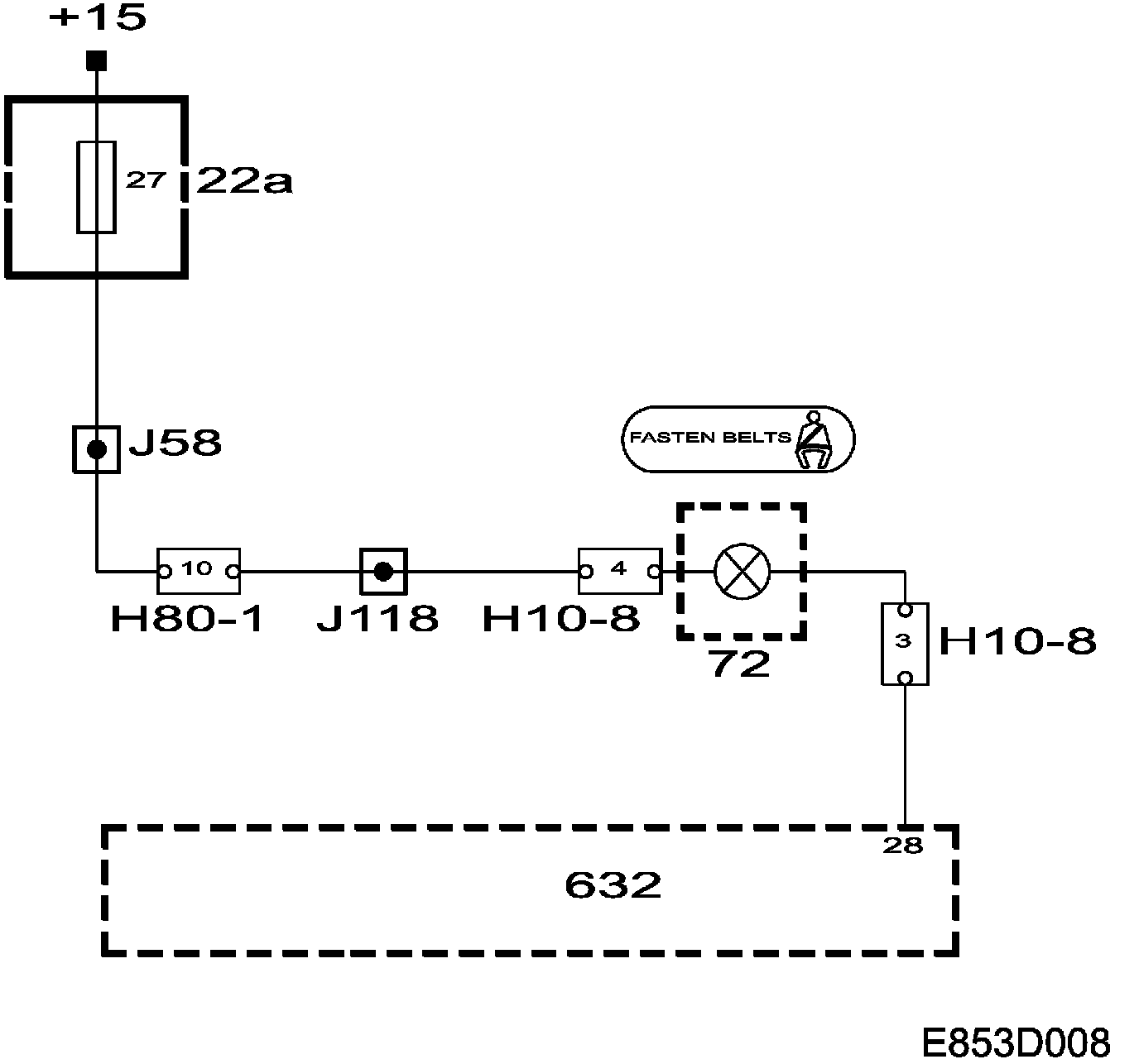The seat belt warning light (72) is turned on via the +15 circuit from fuse 27.