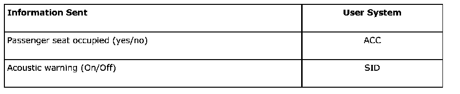 The passenger seat has a sensor that detects when the seat is occupied/loaded. Each buckle has a contact connected with TWICE. If the belt is not fastened, TWICE sends a warning, which is indicated in the following way: