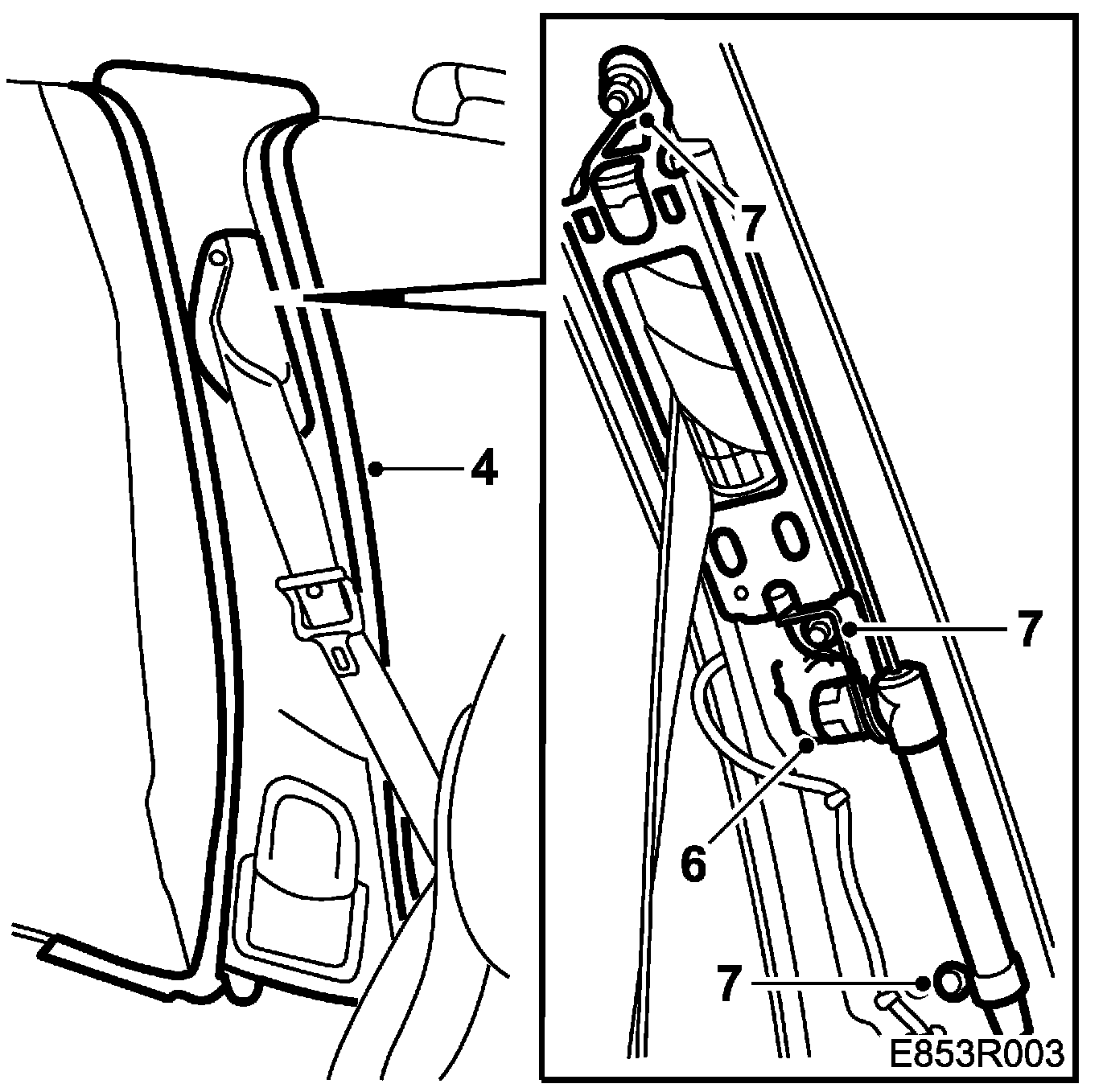 Check that the end fitting is correctly fitted by slackening the belt and pulling directly upwards with a force of 5 N. Check that the catch is visible on the outside of the mounting.