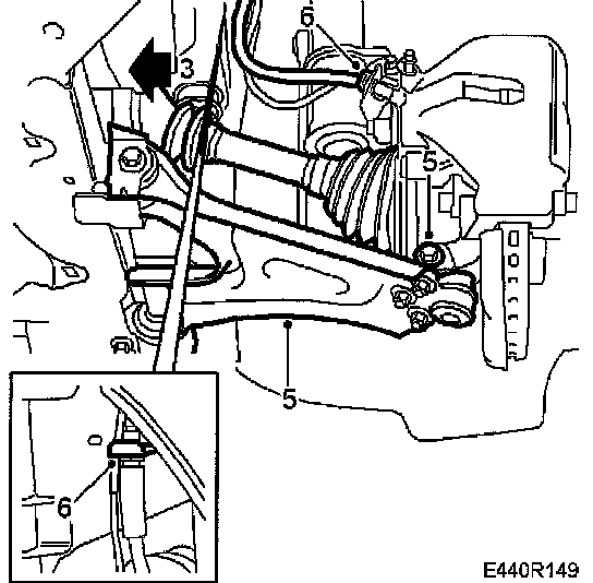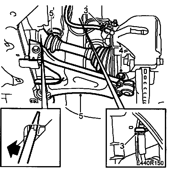 4. Remove the screw securing the ball joint to the steering swivel member. Pry loose and lower the suspension arm. Fixate it position with a wooden block placed between the suspension arm and anti-roll bar.