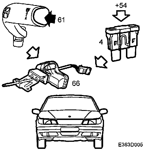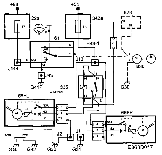 When the switch (61) is activated, +54 voltage is supplied from pin 5 via fuse 37. The two motors (66FL and 66FR) are powered at pin 2.
