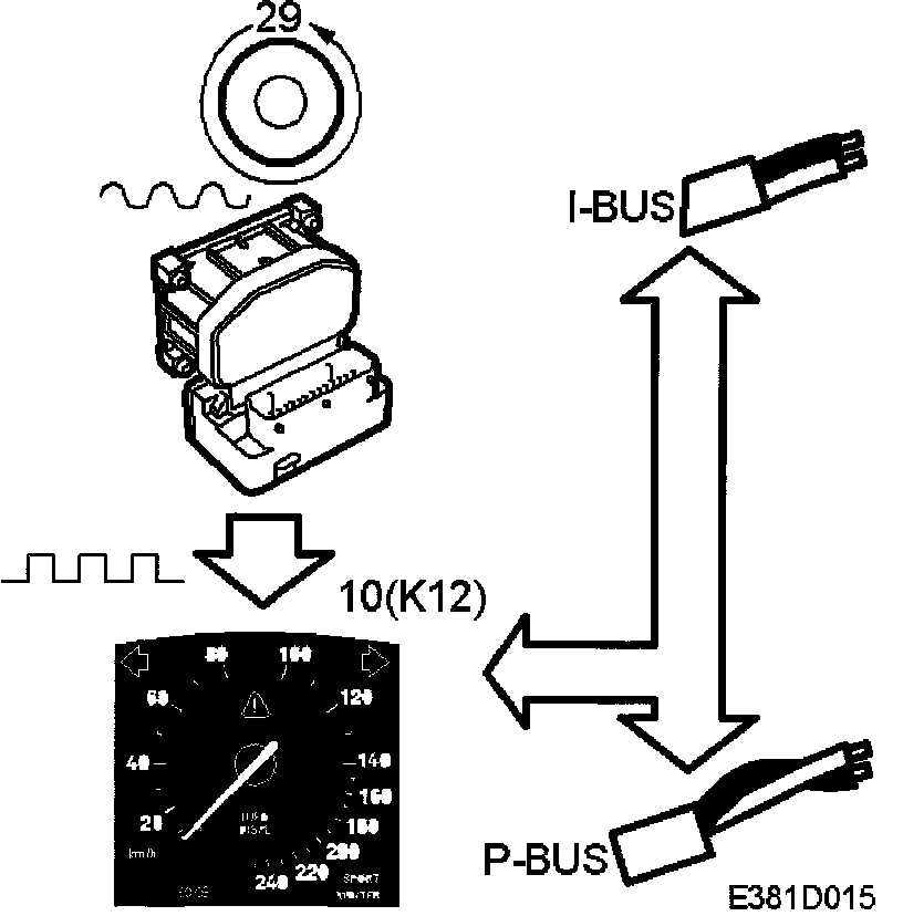The Main Instrument Unit (MIU) receives the wheel-speed signal via a lead connected to the rear left wheel. The reason that a rearwheel sensor has been chosen is that the distance travelled (recorded mileage) can be measured more accurately on a non-driving wheel. The MIU converts the frequency-modulated signal to km/h, a computation that includes a preprogrammed correction for tire size.