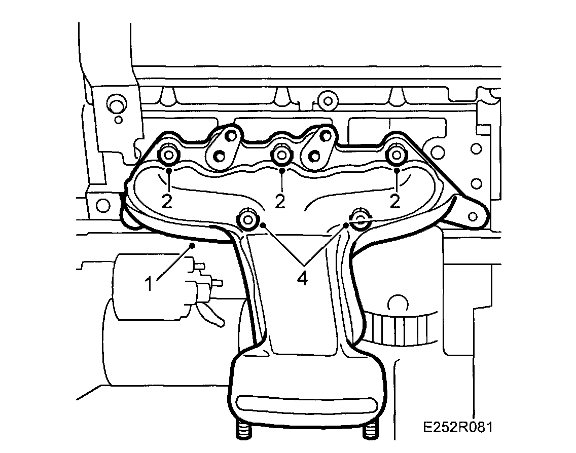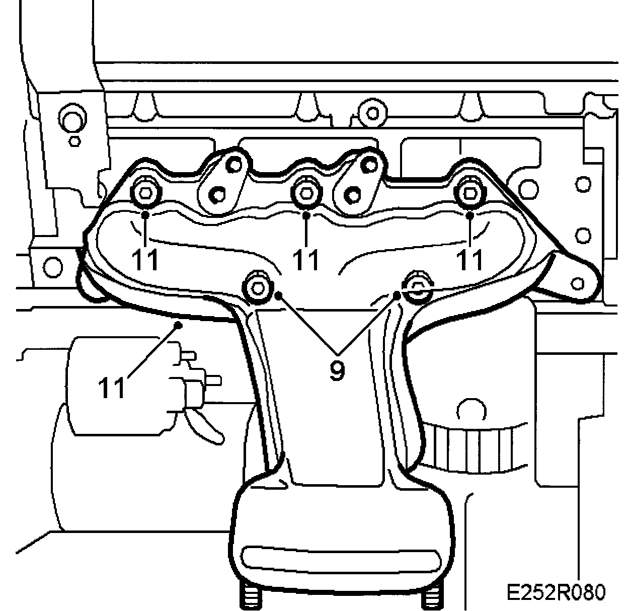 1. Clean the sealing surfaces and fit a new gasket for the rear exhaust manifold. Fit the rear exhaust manifold.