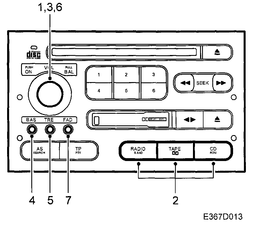 The audio system is turned on/off by pressing the volume control knob. When switched on, the system starts with the last settings that were active.