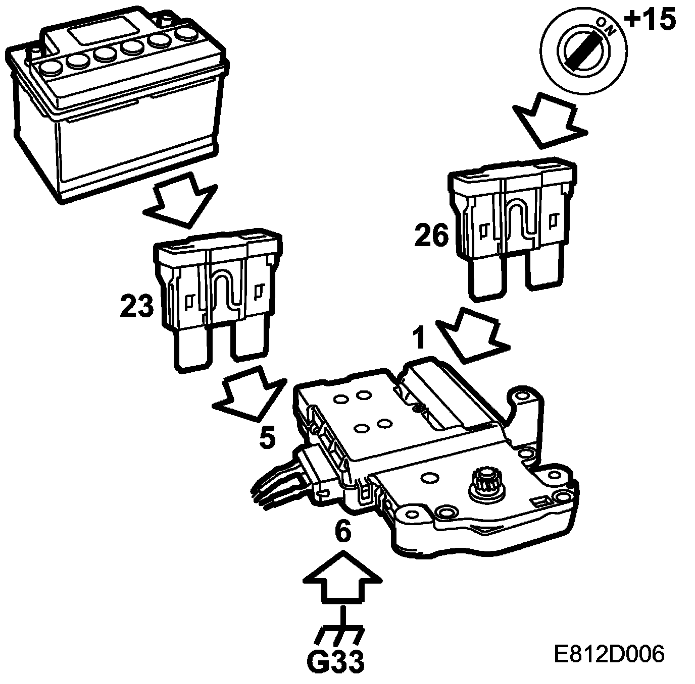 The electric motor is also supplied with +15 on pin 1 via fuse 26.