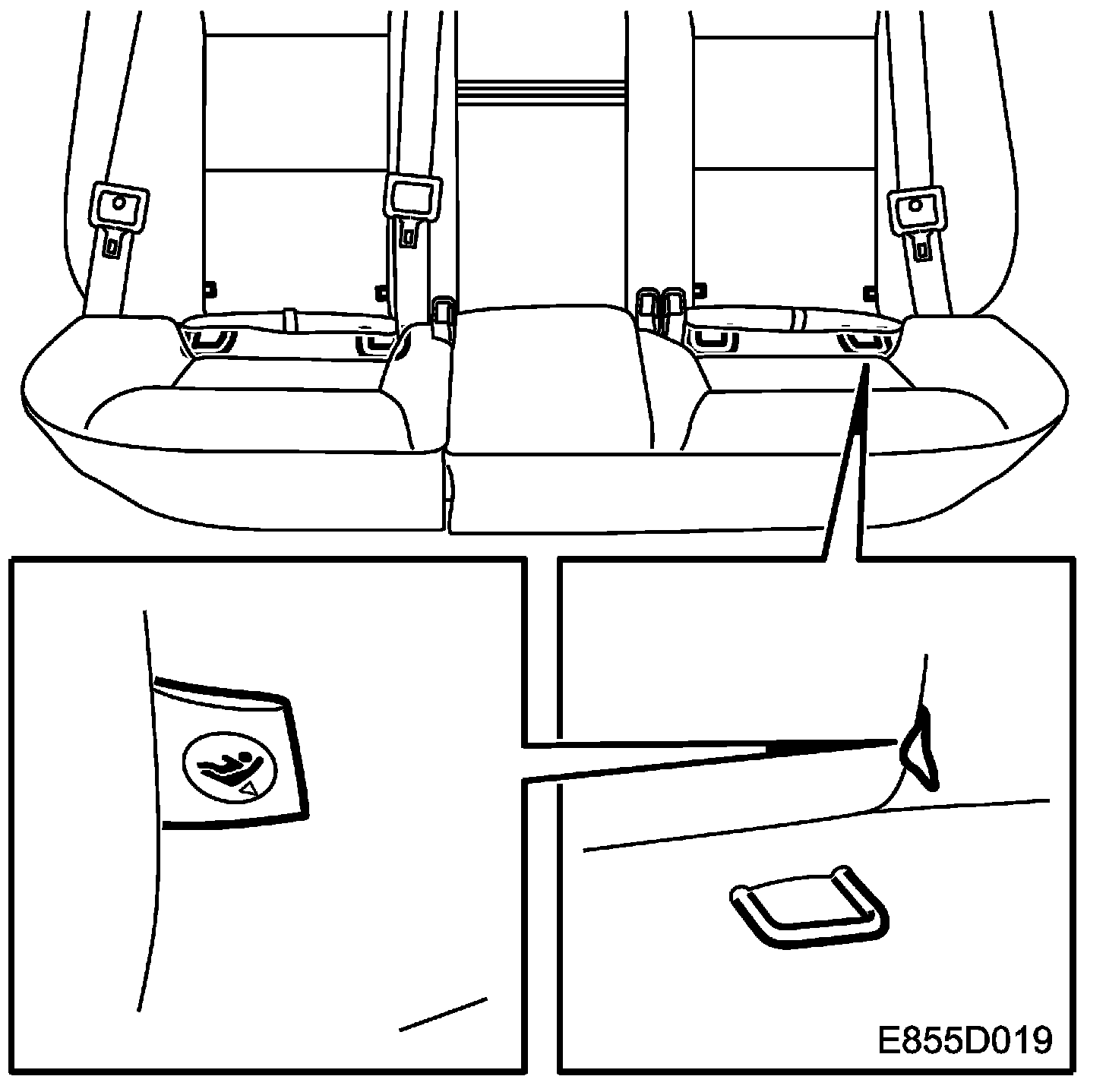 Anchorage points for installing child seats are provided between the backrest and seat squab in the rear seat. These anchorage points consist of two lugs for each child seat located at the two outer seats. Above each lug is a label sewn to the backrest upholstery. The hooks are designed for child seats built in conformity with ISOFIX standards.