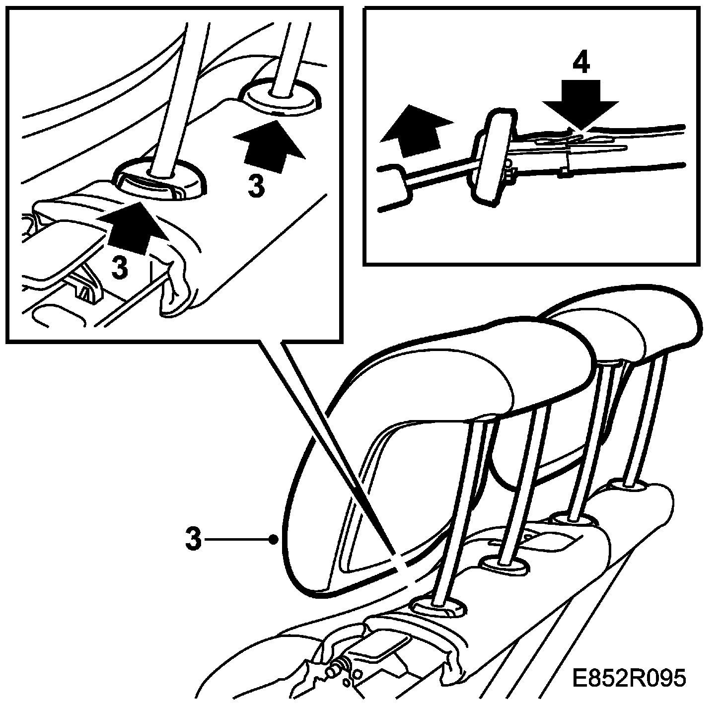 3. Lift out the head restraint by pressing in the catches, one by hand and the other by pressing a small screwdriver against the small catch, while pulling up the head restraint.