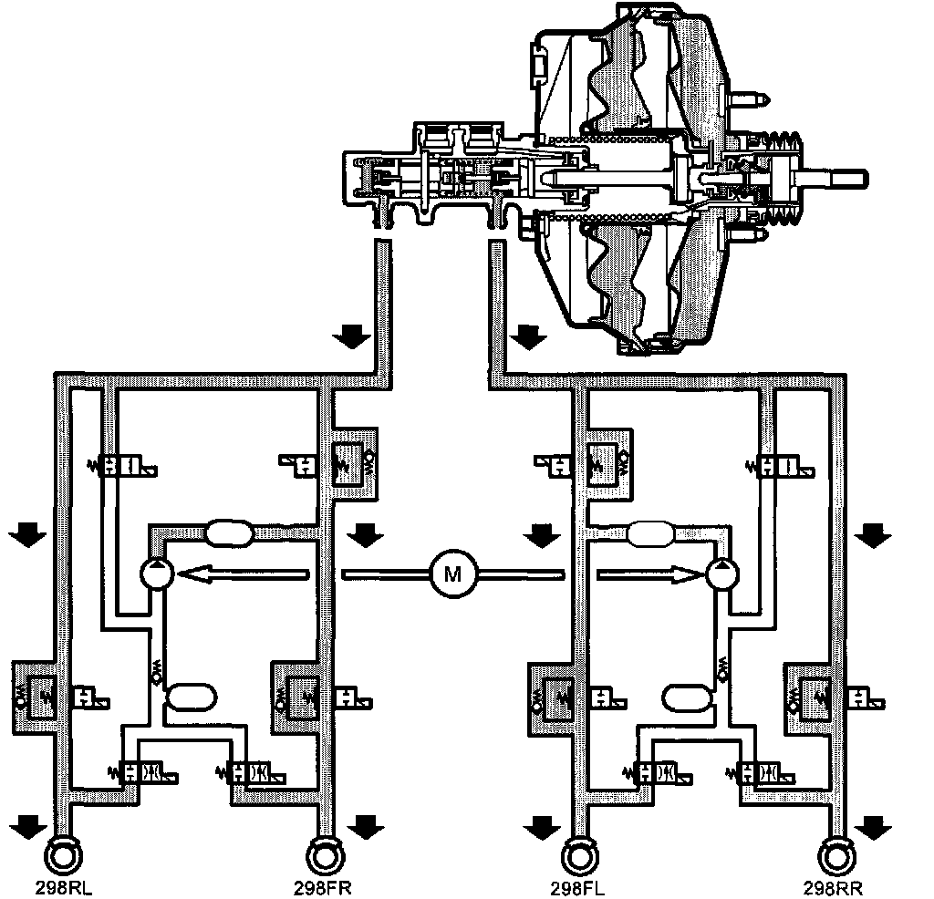 The hydraulic pressure in both brake circuits rises and, since the plungers have the same diameter, the pressure will be the same in both circuits in the valve block.