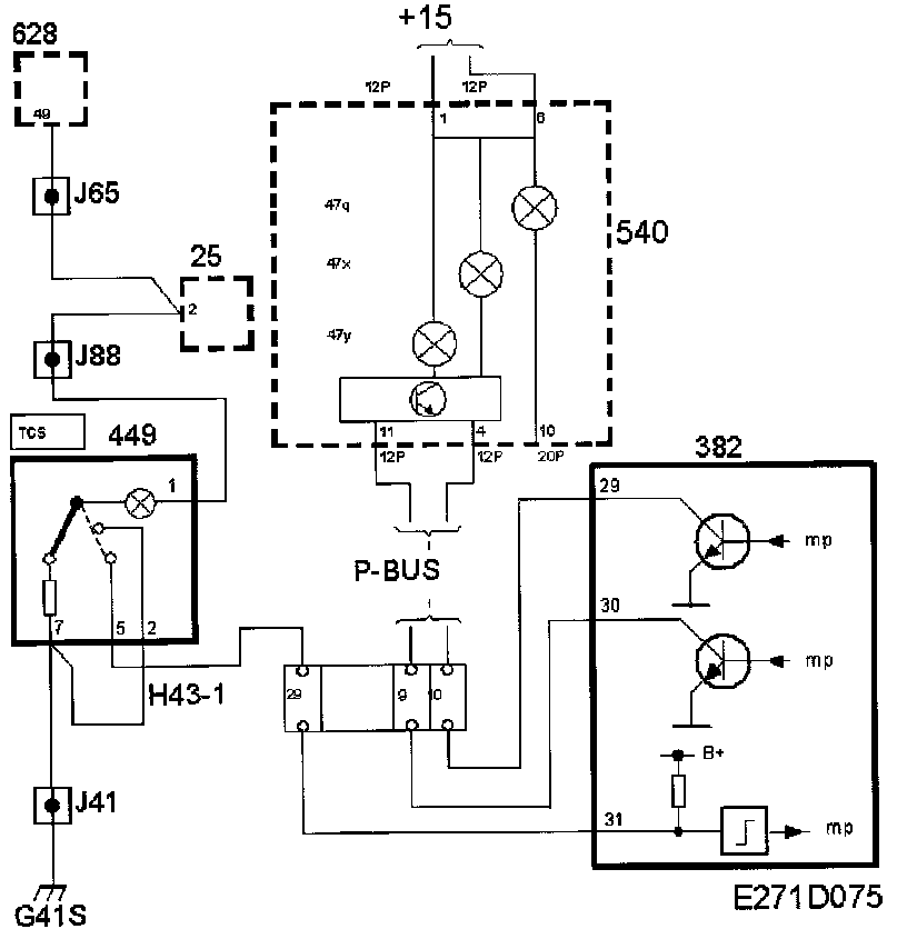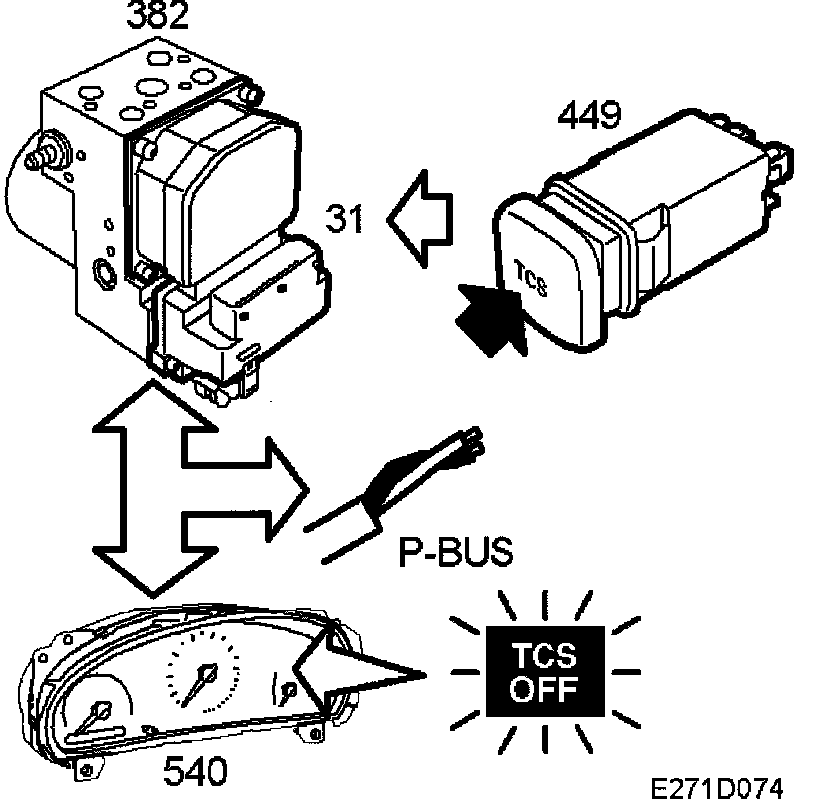 This switch is connected to pin 31 of the TC/ABS control module and to grounding point G41S. The TC/ABS control module applies B+ to pin 31. Pressing the button in connects the circuit to ground and the TCS function is enabled or disabled, depending on the position of the switch.