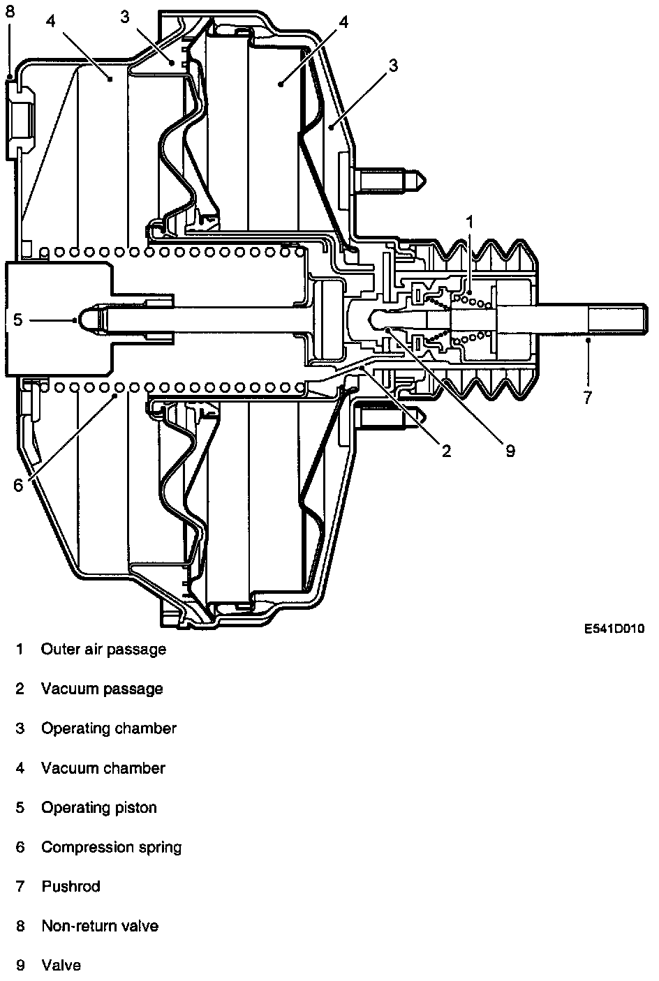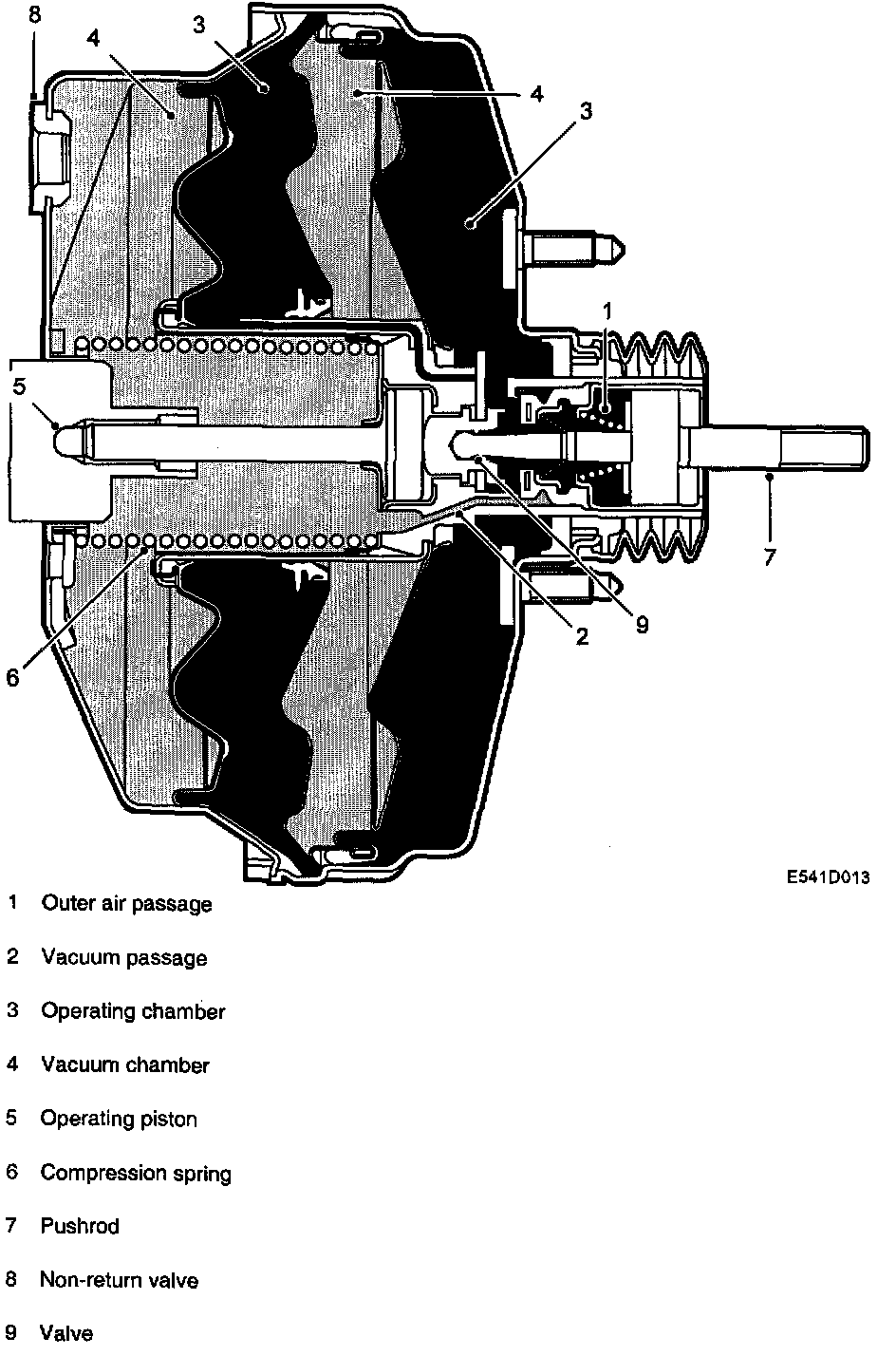 The servo unit consists of a metal casing, valve unit and dual diaphragm mounted between the brake pedal and master cylinder and connected to them by pushrods. If the supply of vacuum to the servo unit fails, the two pushrods act as a single pushrod. The brakes will then work conventionally without servo assistance but much greater pedal force will be required.