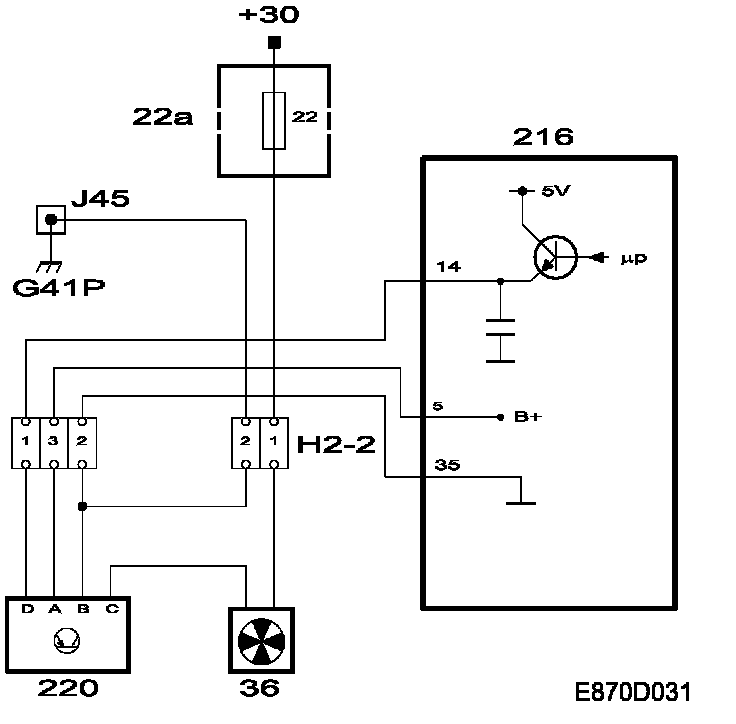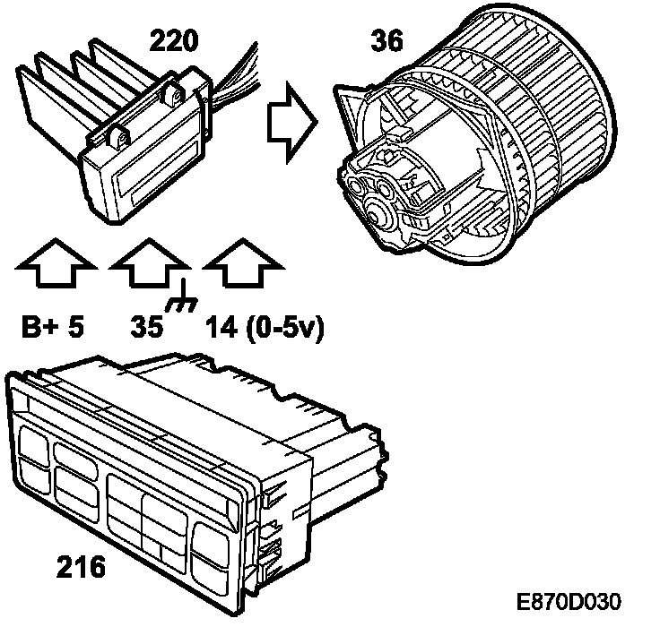 The fan is supplied with +30 from fuse 22. The control module regulates a control unit which supplies the fan motor on the ground side. The fan control unit is situated on the driver's side of the heating and ventilation unit and is cooled by the flow of air in the evaporator.