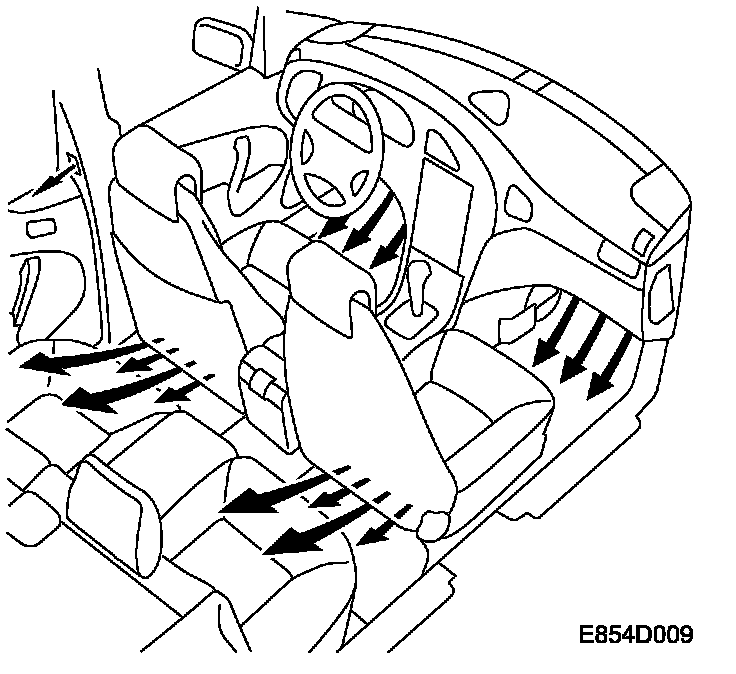 Air is directed to the air outlets under the dashboard, under the front seats to the rear floor ducts and to the B-pillar duct for the rear side windows.