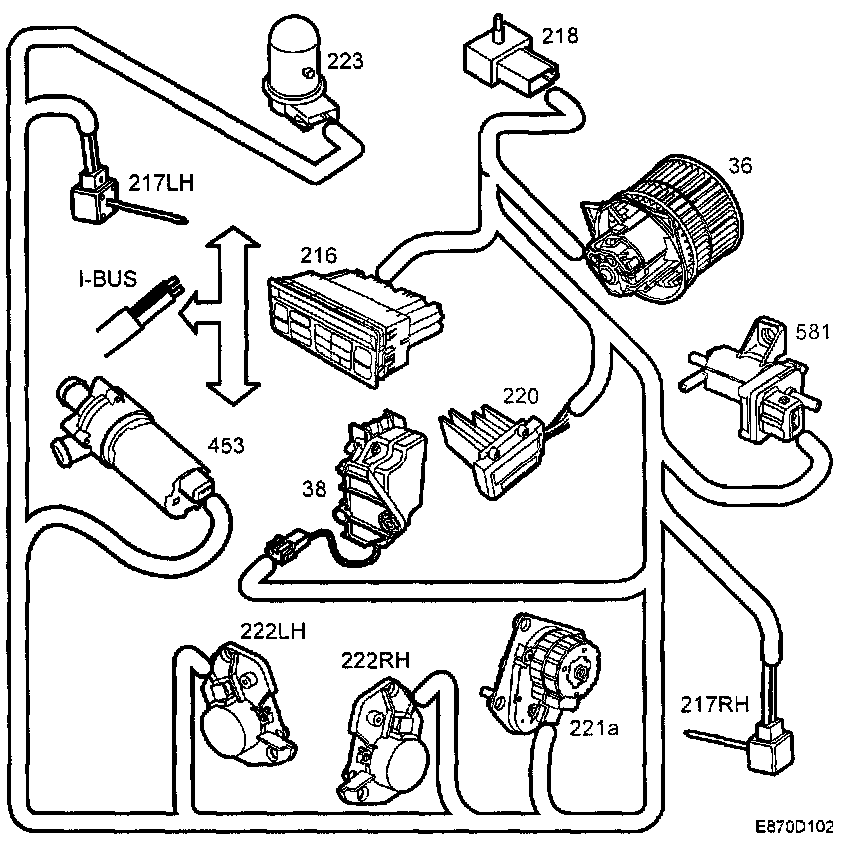 The control module supplies the stepping motor, which turns the air distribution damper for the driver's zone and front seat passenger as well as the air distribution damper for the back seat passengers via a link. Consequently, air distribution is the same for the driver and the passengers.