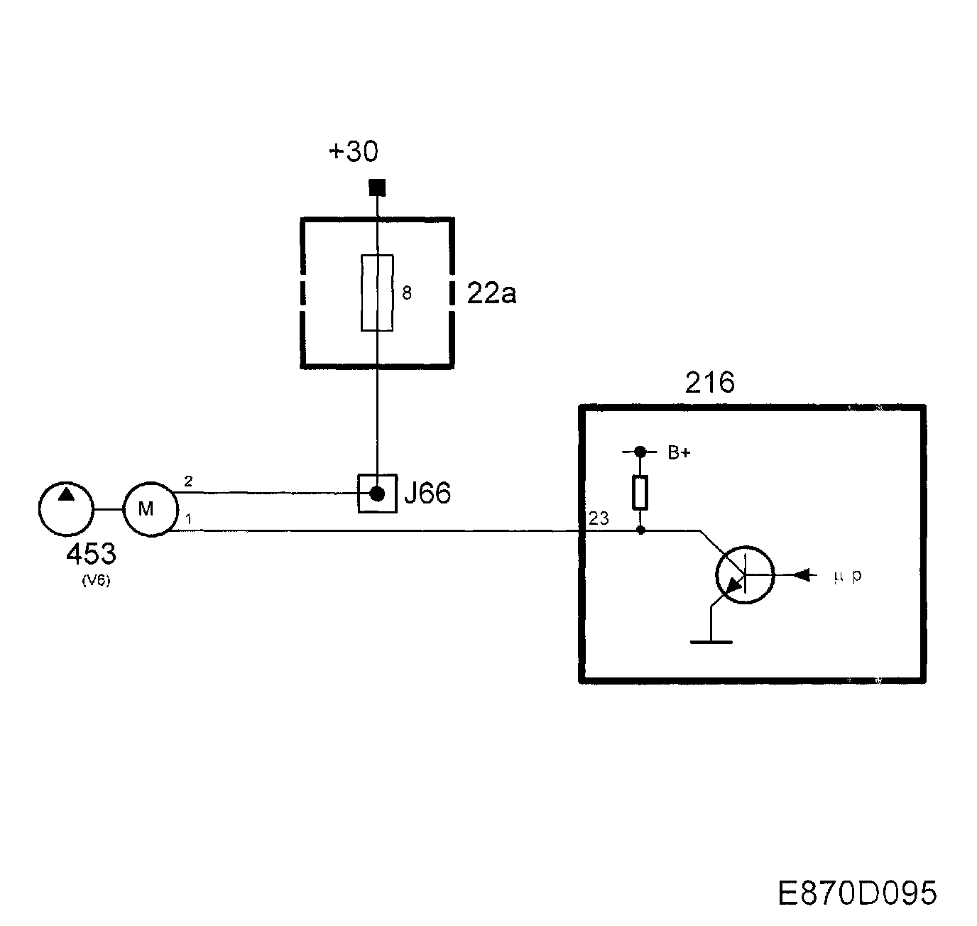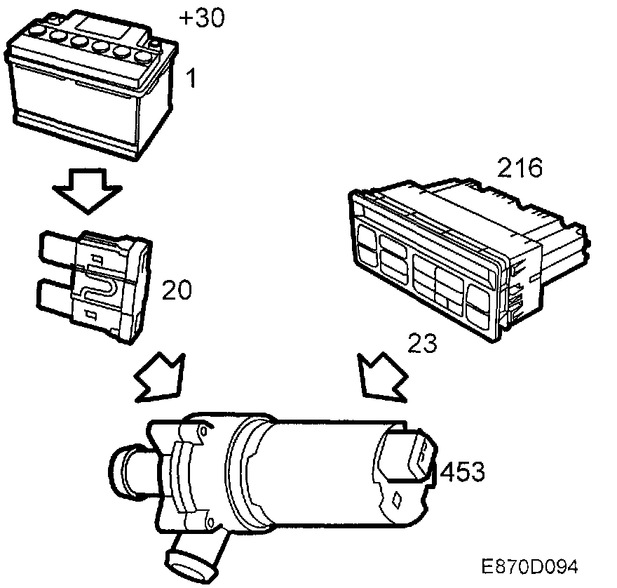 The circulation pump is supplied from +30 from fuse 20 and is controlled on the ground side from pin 23 on the control module.