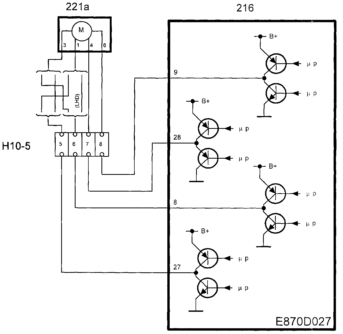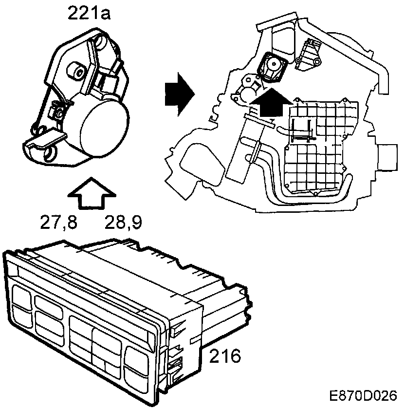 The stepping motor for the air distribution flap is supplied with current from the ACC unit pins 27 and 8 (winding 1) and pins 28 and 9 (winding 2).