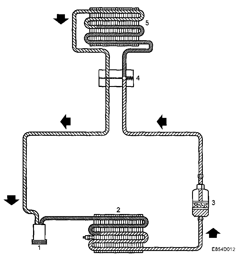 Once the refrigerant has expanded, it changes to a gaseous state (evaporates). For this to take place, heat is required. This heat is taken from the air surrounding the evaporator and the cooled air is then led into the cabin. The refrigerant is led back to the compressor in a gaseous state.