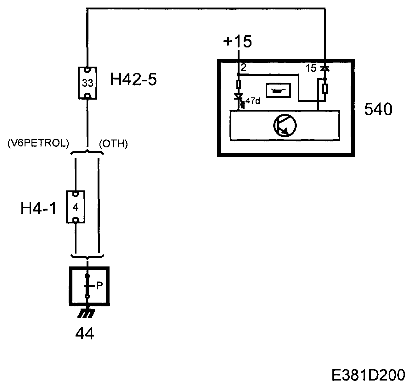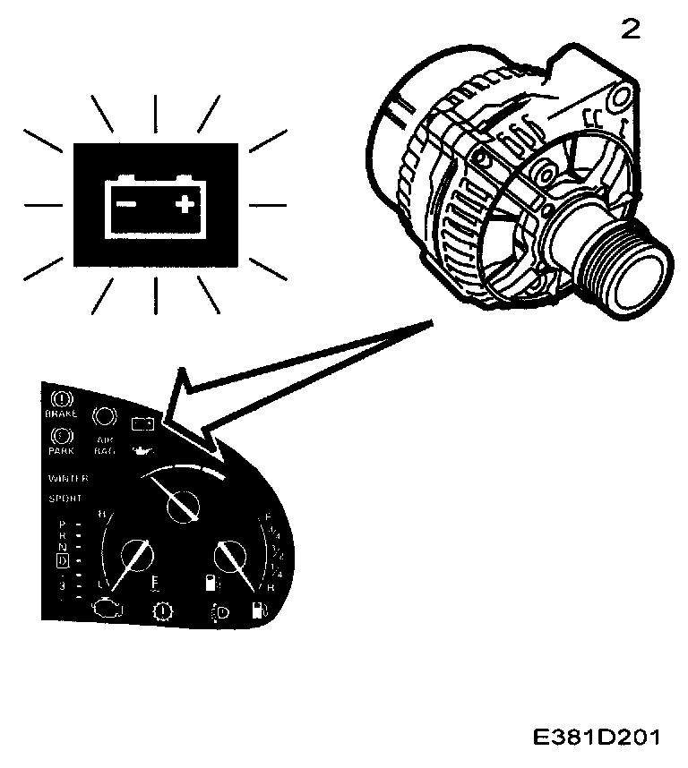 If the generator is not turning or not charging for any reason, pin 6 on the main instrument unit is grounded via the regulator from the generator field winding, whereupon the control module lights the lamp. At the same time the central warning lamp is lit and at engine speeds above 300 rpm, the MIU sends a request to SID to activate the acoustic signal.