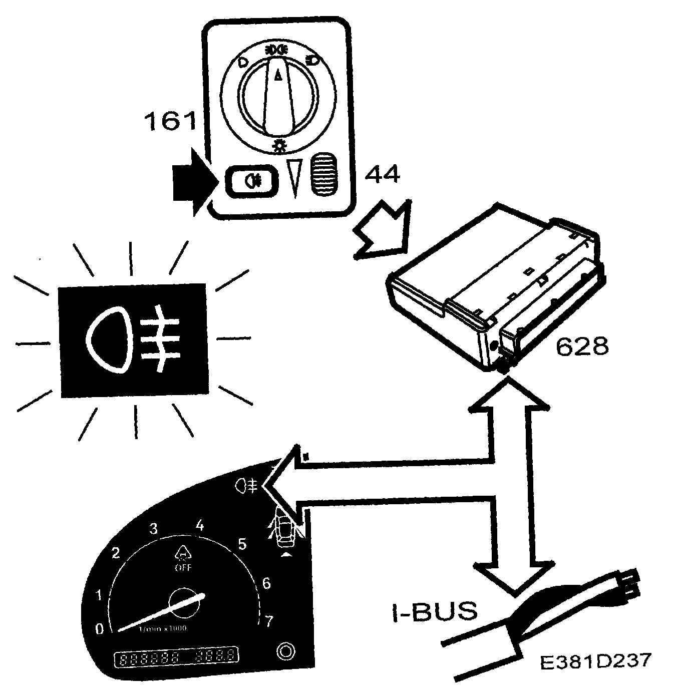 On receiving REAR FOG LIGHT ON, the control module grounds the output of the lamp which then lights up.